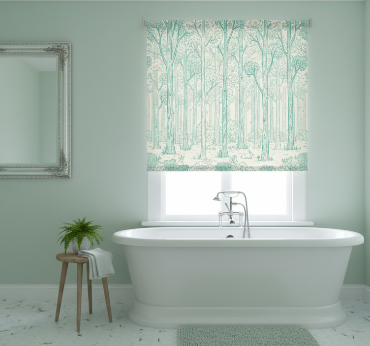 Referanse:: E6132Oppdag Rullegardin trær mint skogskisse, et fantastisk produkt som kombinerer estetikk med funksjonalitet! Dette designet har en vakker skogskisse med trær i myke mintfarger, som gir rommet ditt en beroligende atmosfære. Den grafiske fremstillingen av naturen skaper en harmonisk og stilren innredning som vil glede både deg og dine gjester!
