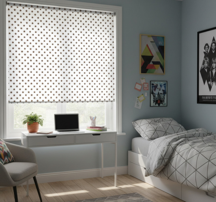 Referanse:: E7542Oppdag den unike Rullegardin ungdom brune stjerner! Med sitt grafiske design som kombinerer stilige brune stjerner på en elegant bakgrunn, tilfører denne rullegardinen et lekent og moderne preg til ethvert ungdomsrom. Den er ikke bare vakker, men også funksjonell, og tilbyr enkel montering med 2 klikk, lett rengjøring og rask demontering. Denne rullegardinen beskytter rommet mot direkte sollys, gir ønsket personvern, og hjelper til med å regulere romtemperaturen, samtidig som den gir sikkerhet til huset ved å la deg se ut uten å bli sett.