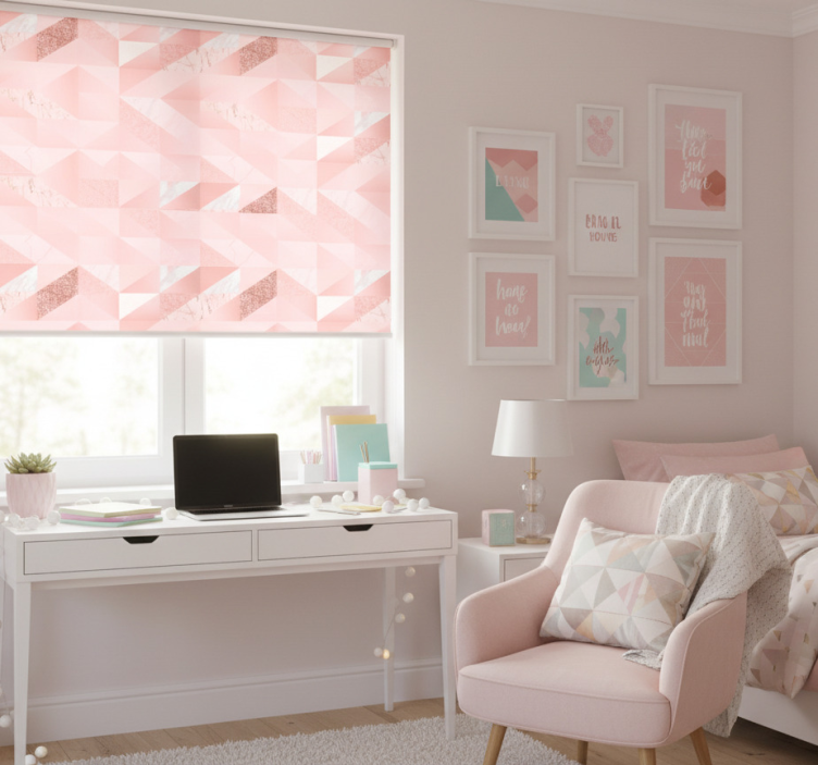 En Rullegardin ungdom med jentete rosa geometrisk bakgrunn rullegardin ungdom gir en fantastisk mulighet til å uttrykke personligheten til den unge jenta i hjemmet. Denne rullegardinen fungerer ikke bare som en funksjonell løsning for å regulere lys og temperatur, men også som et stilig dekorativt element. Med sitt moderne design kan den enkelt integreres i ethvert interiør, og den gir et friskt pust til rommet. La kreativiteten blomstre og inviter til glede med denne fantastiske rullegardinen!