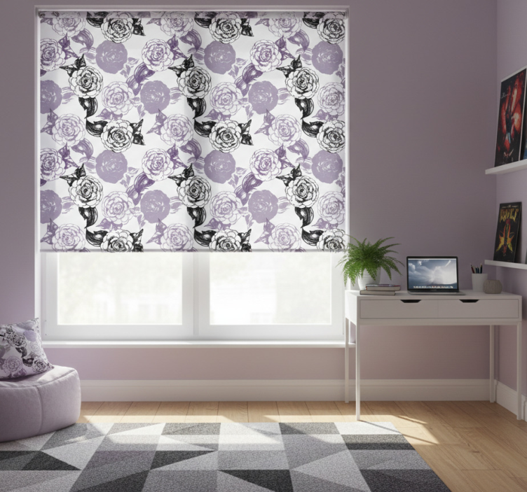 Rullegardin ungdom med lilla og svart blomsterdesign