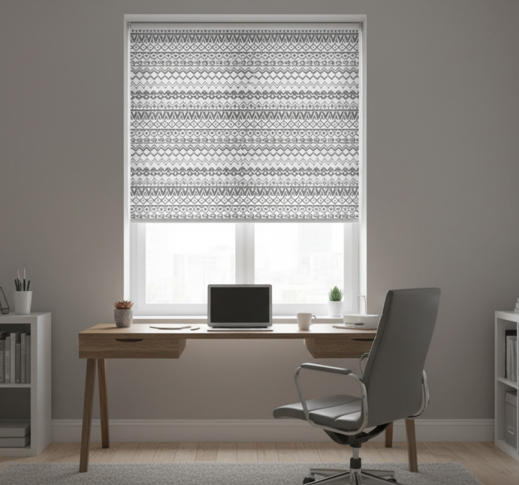 En svart rullegardin med håndtegnet tribal mønster svart rullegardin er ikke bare en funksjonell dekorasjon, men også et kunstverk som kan forvandle ethvert rom. Med sitt unike design tilfører den karakter og stil, noe som gjør den til et ideelt valg for dem som ønsker å skape en inspirerende atmosfære. Rullegardinen lar lyset spille inn i rommet på en behagelig måte og gir samtidig mulighet for privatliv. La den bli midtpunktet i stuen, soverommet eller kontoret!