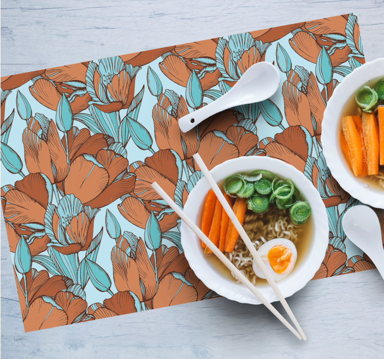 Blått og brunt tulipanmønstret dekkebrikke.