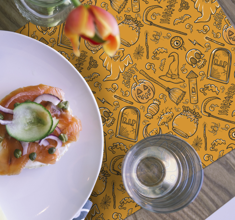 Gjør Halloween-feiringen enda mer spennende med vår Spisebrikke halloween med skumle motiver! Dette fantastiske produktet har et grafisk design som fanger øyet med sitt livlige mønster av spøkelser, hodeskaller, gresskar, edderkopper og gravsteiner. De strålende oransje fargene setter virkelig stemningen for festlighetene, og med slike tegninger vil borddekkingen garantert bli en snakkis. Enten du planlegger et skummelt middagsselskap eller en koselig kveld med familien, vil disse spisebrikkene være den perfekte dekorasjonen!