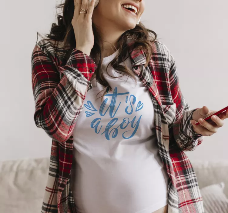 Referanse:: T4442Dette bildet viser en glad mor som holder en telefon mens hun har på seg en spesiell graviditetstop som uttrykker spenningen ved en babys ankomst. Det muntre designet fremhever setningen 'It's a boy' i en stilfull skrifttype, noe som gjør det perfekt for å feire kjønnsavsløringer eller graviditetsmilepæler.