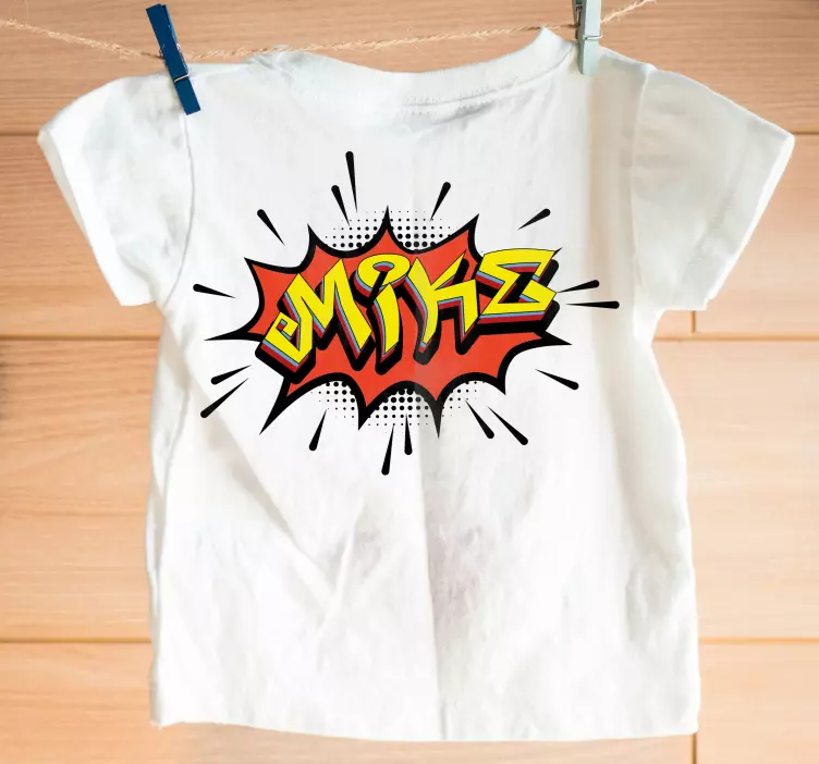 Referanse:: T4538Dette lekne designet har et livlig tegneserieaktig utbrudd med navnet 'Mike' tydelig vist. De sterke fargene og dynamiske formene skaper en energisk appell, perfekt for en morsom og glad atmosfære for barn.