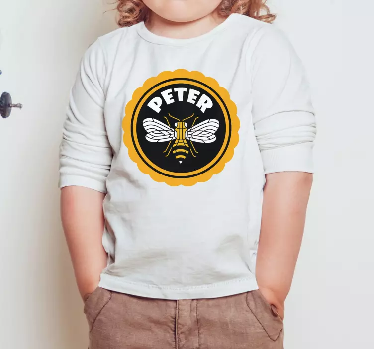 Referanse:: T4984Dette sjarmerende designet har en livlig bieillustrasjon omkranset av en fet, gul scalloped kant. Navnet 'Peter' er tydelig vist og gir en personlig touch, noe som gjør det perfekt for barn. Kombinasjonen av lekne farger og et engasjerende motiv skaper et tiltalende utseende for barneklær.