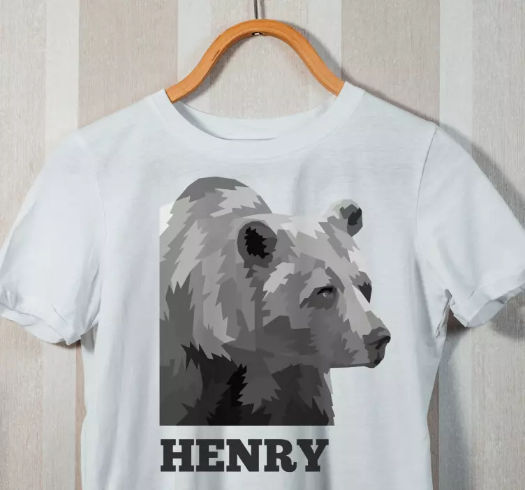 Referanse:: T4983Dette designet har en bjørn avbildet i en geometrisk stil, som gir en unik fremstilling. Navnet 'Henry' følger med dyret, noe som skaper en personlig touch. De grå tonene tilfører et moderne element, noe som gjør det tiltalende for et bredt publikum.