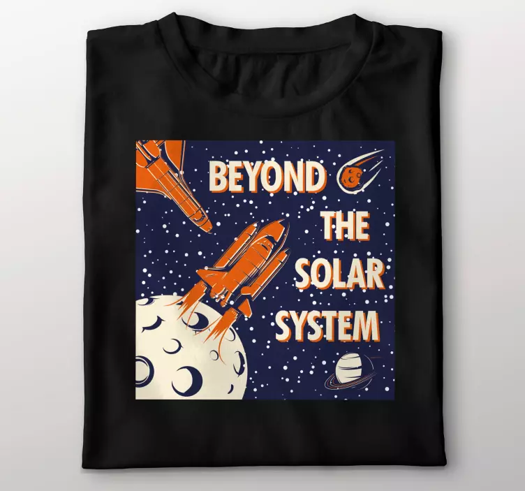 Referanse:: T4800Dette designet har et fengslende eventyr i rommet, med en rakett som svever forbi planeter og en måne. De livlige fargene og den dristige typografien inviterer til utforskning og nysgjerrighet om kosmos, noe som gjør det til et attraktivt valg for alle som er fascinert av "space travel".