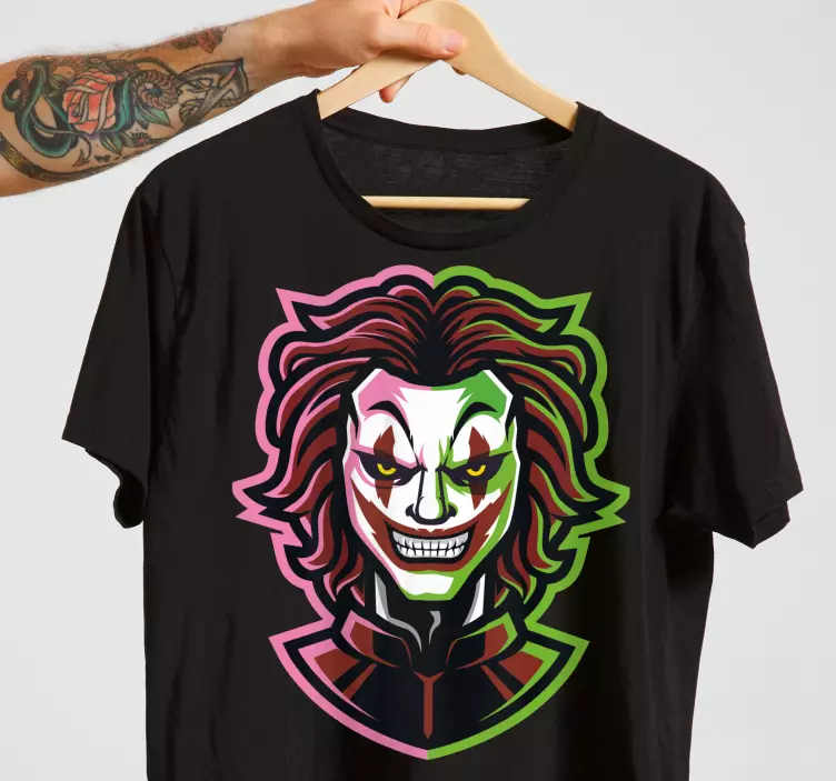 Referanse:: T4710Dette designet har en slående og truende klovnkarakter, fremhevet av livlige farger og et truende ansiktsuttrykk. Ideelt for Halloween, blander det elementer av skrekk med en unik grafisk stil, noe som gjør det til et fremtredende verk for de som omfavner den skumle sesongen.