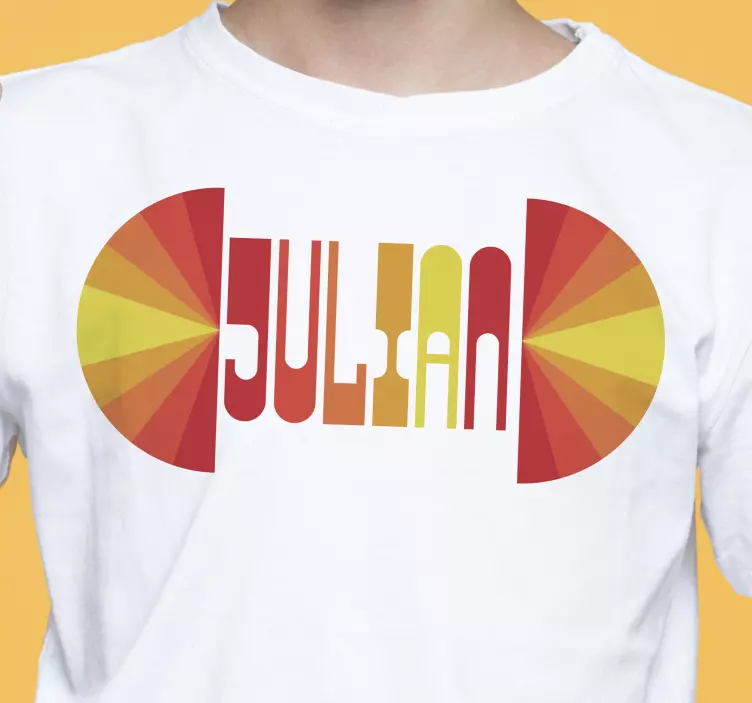 Referanse:: T4236Dette stilige stykket har en livlig navnevisning i fet typografi. Designet inkluderer varme farger som stråler i et sirkulært mønster, noe som skaper et iøynefallende fokuspunkt. Ideelt for å vise frem individualitet og en følelse av stil.