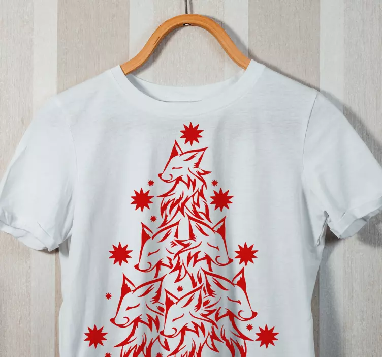 Referanse:: T5438Dette unike festdesign har intrikat arrangerte ulvehoder i en pyramideformasjon, supplert med stjernesymboler. Den livlige røde fargen skiller seg ut mot den hvite bakgrunnen, noe som gjør det til et iøynefallende stykke perfekt for høytiden.