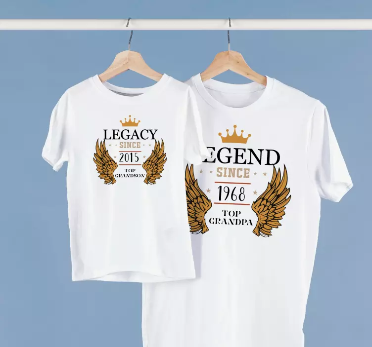 Denne t-skjorten er den perfekte måten å vise familiens stolthet på en moteriktig måte. Designet har en krone med vinger og en respektiv tekst: arv siden... Topp barnebarn, legende siden... Topp barnebarn. Denne matchende skjorten til bestefar og barnebarn er en unik måte å vise familiebåndet ditt på og vil se flott ut ved alle anledninger. Den er laget av høykvalitets bomull som er behagelig å ha på seg og kan vaskes i maskin, noe som gjør den til et flott daglig bruksplagg.