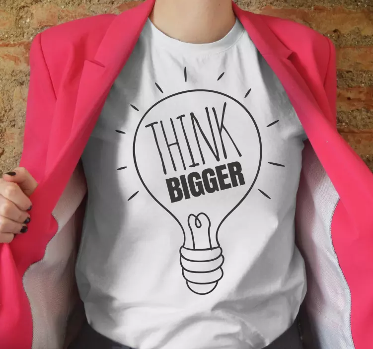 Referanse:: T4862Dette designet viser en lyspære med frasen 'Think Bigger' i fete bokstaver. Bildet fremkaller en følelse av inspirasjon og positiv tenkning, ved å bruke enkle, men kraftfulle visuelle elementer som harmonerer med et motivasjonstema.