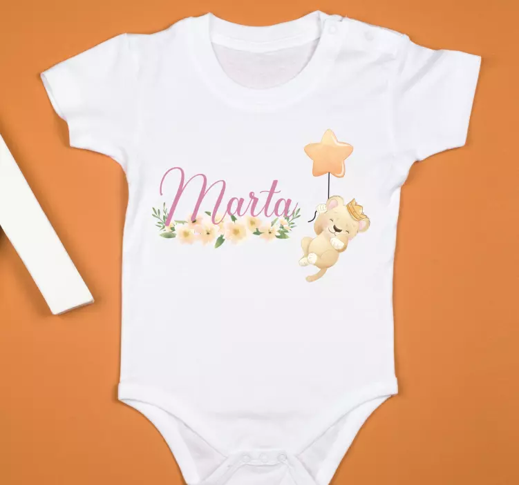 Referanse:: T5219Dette sjarmerende designet har en søt bjørn som holder en stjerneslipp, supplert med delikate blomsterelementer. Navnet 'Marta' er elegant integrert i kunstverket, noe som skaper en gledelig og personlig touch perfekt for babyklær.