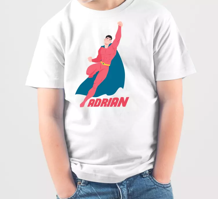 Referanse:: T4420Med en dynamisk superheltkarakter i livlige farger, fanger dette designet ånden av eventyr og moro. Den energiske posen, fremhevet av den flagrende kappen, appellerer til barn og bringer spenning til garderoben deres. Perfekt for feiringer, legemliggjør det glede og fantasi.