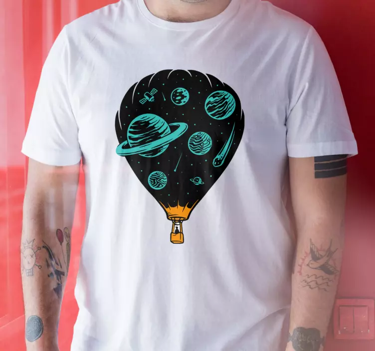 Referanse:: T5406Dette fengslende designet har en varmluftsballong fylt med fantastiske himmellegemer. Livlig illustrerte planeter og asteroider skaper en følelse av kosmisk eventyr, som appellerer til både drømmere og oppdagere. Perfekt for de som elsker universets underverker.