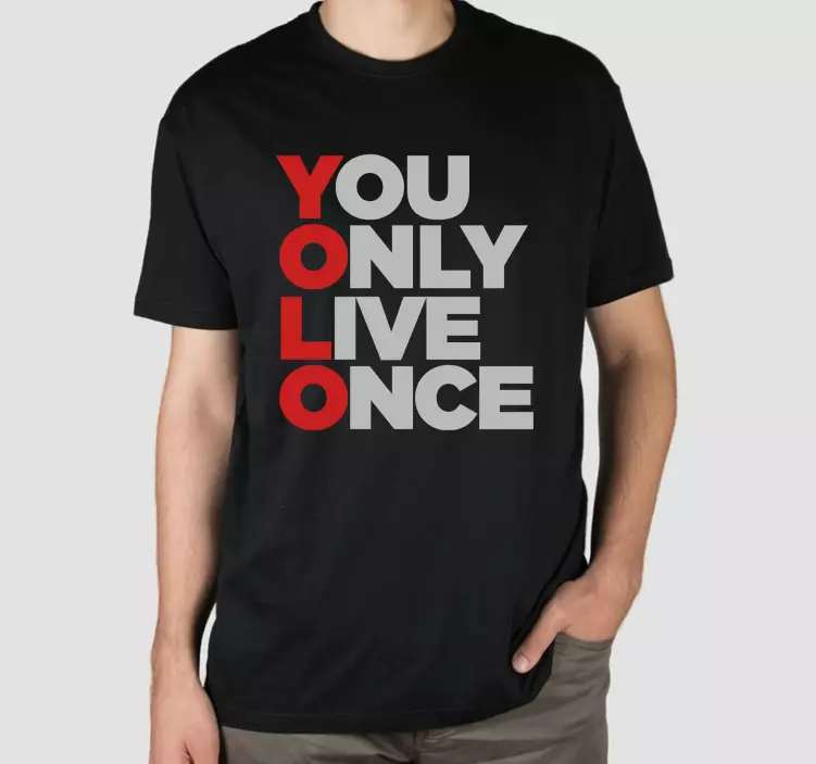 Referanse:: T4851Denne dristige kleskolleksjonen har den kraftfulle setningen 'You Only Live Once', som understreker budskapet om å leve livet fullt ut. Designet bruker sterk typografi med kontrasterende farger, noe som gjør det iøynefallende og tiltalende for de som ønsker å uttrykke en livlig holdning.