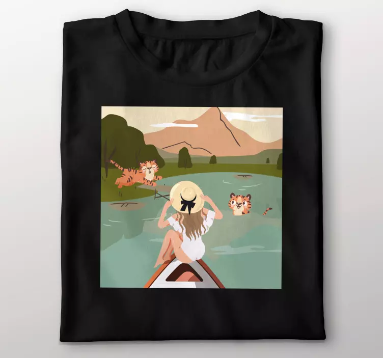 Oppdag en verden av fantasifulle eventyr med vår T-skjorte med eventyr med tigre! Dette grafiske designet fanger oppmerksomheten med en sjarmerende illustrasjon av en pike som utforsker naturen, omringet av majestetiske tigre og et vakkert landskap med innsjøer og skog. Tegnefilmen gir liv til motivet, og skaper en følelse av avslapning og eventyr utendørs. Perfekt for både barn og voksne som ønsker å uttrykke sin kjærlighet for dyr og natur!