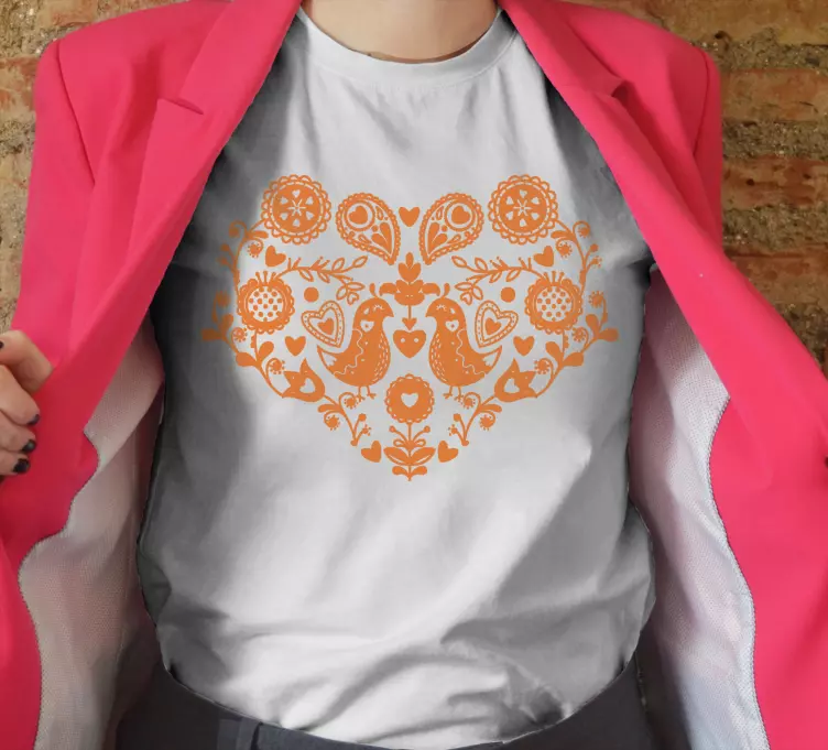 Oppdag en fantastisk T-skjorte med fugler i hjerte mønster som kombinerer grafisk kunst med tradisjonelle elementer. Dette utsøkte designet har et vakkert folklore preg, med blomster og fugler som skaper en kjærlighetsfylt atmosfære. Den florale utsmykningen, som er både tradisjonell og moderne, gir et unikt uttrykk i svart og hvit. Hjerteformen i designet fremhever den varme følelsen av folk og samhold, noe som gjør denne t-skjorten til et perfekt valg for enhver anledning!