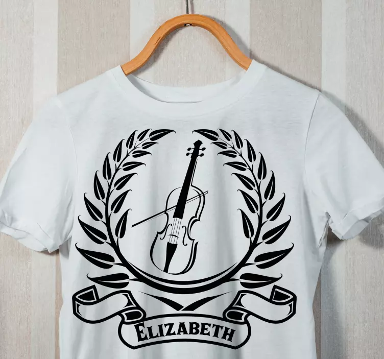 Referanse:: T4492Dette unike designet har en fiolin i sentrum, omgitt av en laurbærkrans. Navnet 'Elizabeth' er elegant presentert i et bånd under emblemet, noe som gir en personlig touch. Den monokromatiske fargepaletten fremhever den klassiske og raffinerte naturen i temaet.