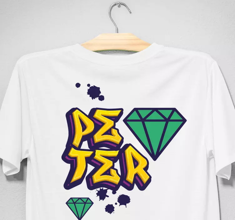 Oppdag vår T-skjorte med navn peter diamant design, hvor graffiti og gatekunst smelter sammen i et unikt grafisk uttrykk! Dette designet er inspirert av urban kultur, med fargerike og lekne elementer som tagging og veggmaleri. Med muligheten for tilpasning kan du gjøre denne t-skjorten personlig og unik, og vise frem ditt navn på en stilfull måte. Den kombinerer en moderne urban stil med diamantdesign som virkelig skiller seg ut!