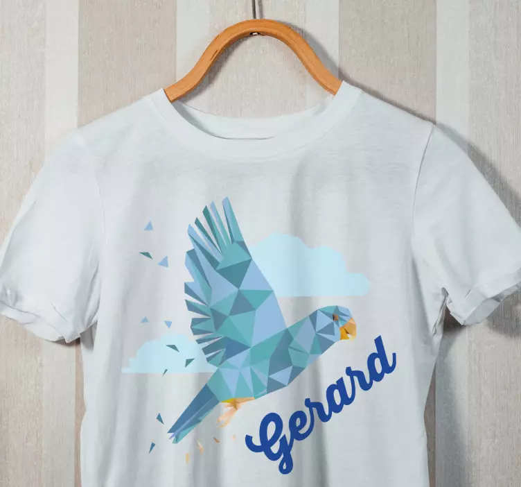Referanse:: T4986Dette designet har en geometrisk fremstilling av en papegøye i flukt, komplementert av myke skyer. De livlige blå tonene gir et dynamisk utseende, mens navnet 'Gerard' tilfører en personlig touch. Perfekt for de som setter pris på unik og iøynefallende kunst.