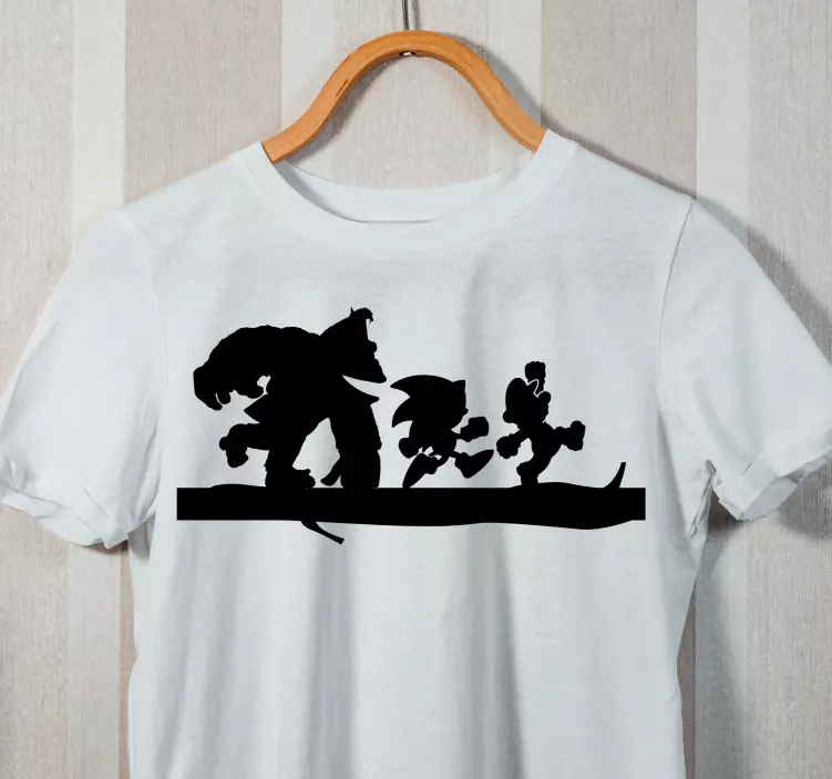 Referanse:: T4646Dette designet viser dynamiske silhuetter av kjære helter i en leken sammensetning. Den slående kontrasten mot en hvit bakgrunn fremhever bevegelse og energi, noe som appellerer til fans av eventyrlige temaer. Et ideelt valg for å vise beundring for ikoniske karakterer.