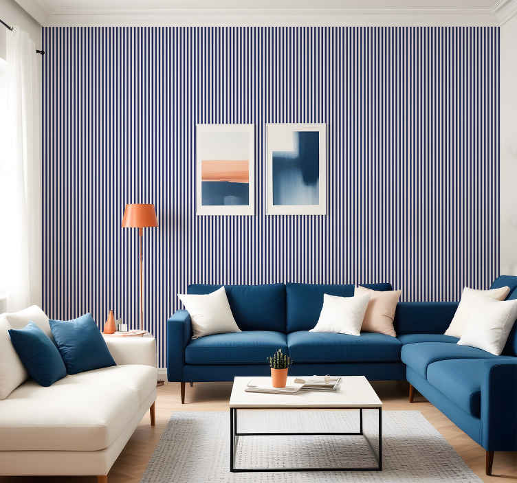 Referanse:: P6334Den marineblå farge tapetet vertikalt har et grafisk design med vertikale, marineblå og hvite linjer. Dette er en moderne og frisk design som vil gi ethvert rom et unikt utseende!