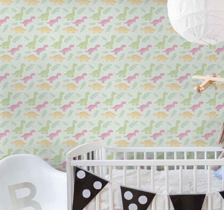 Referanse:: P6439En sjarmrende mønster med lekne dinosaurer i pastellfarger som er ideell for et barnerom. Dette designet inkorporerer søte dinosaurer og skaper en mild, innbydende atmosfære for å utvikle fantasifulle sinn.