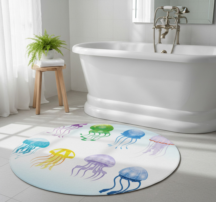 Det bad vinyl teppe i blekksprutfarger er perfekt for å skape et lekent og energisk miljø i badet ditt. Den fargerike designen lyser opp rommet og gir en unik atmosfære som både er innbydende og stimulerende. Med dette teppet kan du enkelt transformere badet til et stilfullt fristed, hvor du kan slappe av og nyte tiden din. La fargene inspirere deg til å skape en romslig og livlig oase!