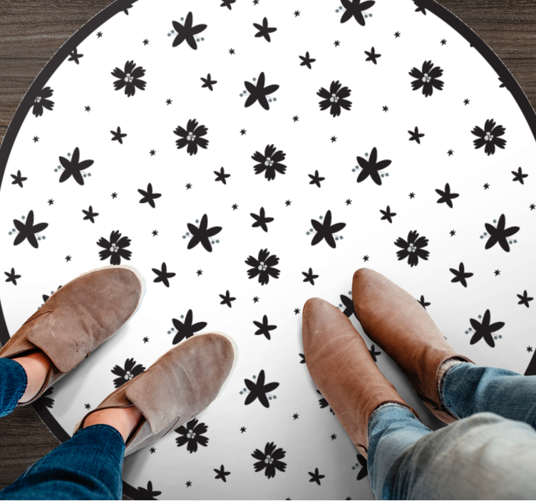 Velkommen til en verden av stil og eleganse med vårt Blomster og planter vinyl teppe blomsterstjerner. Dette unike designet kombinerer vakre blomster og blomster i et fantastisk mønster som utstråler harmoni i både svart og hvit. Det grafiske uttrykket gir rommet ditt en moderne og sofistikert atmosfære, perfekt for ethvert hjem!