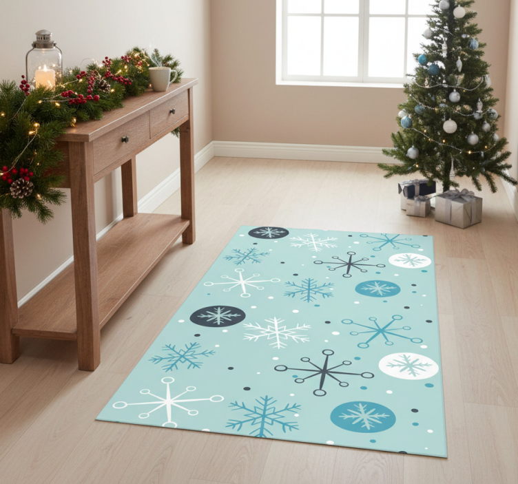Et Jul vinyl teppe dekorative blå og hvite snøfnugg Jul vinyl teppe er ideelt for å forvandle ditt hjem til en festlig oase. Den livlige fargekombinasjonen og det unike snøfnuggdesignet gir en magisk følelse som setter den perfekte stemningen for julen. Det er ikke bare en dekorasjon, men en innbydende detalj som sprer glede og varme i hjemmet ditt!