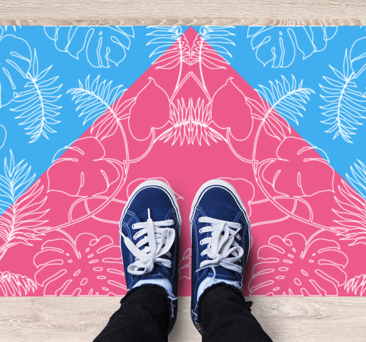 Oppdag vårt Tropisk bladidé vinyl teppe natur, som kombinerer et grafisk design med geometriske former. Dette teppet har en fantastisk triangel- og bladmotiv, med en harmonisk blanding av rosa og blå farger som gjenspeiler naturens skjønnhet. Med sine stilige linjer og blader, tilfører dette teppet en moderne touch til ethvert rom!