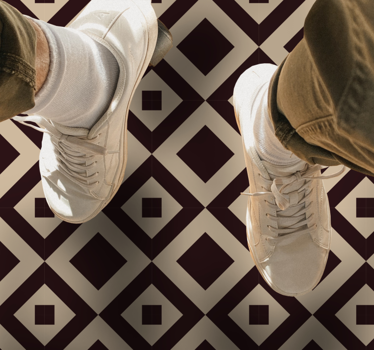 Dette er et vinyl teppe i vintage stil med illustrasjonen av beige kvadratmønster, ideelt for gulvet på badet, kjøkkenet, stuen, spisestuen eller et annet sted å se fornyet på få minutter med et kvalitetsprodukt.