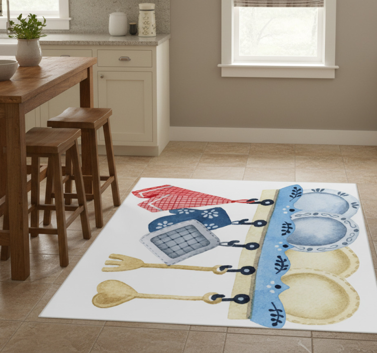 Referanse:: R23667Oppdag vårt vinylteppe kjøkken med håndtegnede kjøkkenredskaper, en perfekt kombinasjon av stil og funksjonalitet! Dette unike designet gir et kunstnerisk preg til ditt kjøkken med detaljerte illustrasjoner som fremhever sjarmen ved matlaging. Med sine klare farger og kreative mønstre, vil dette teppet garantert bli et blikkfang i hjemmet ditt!