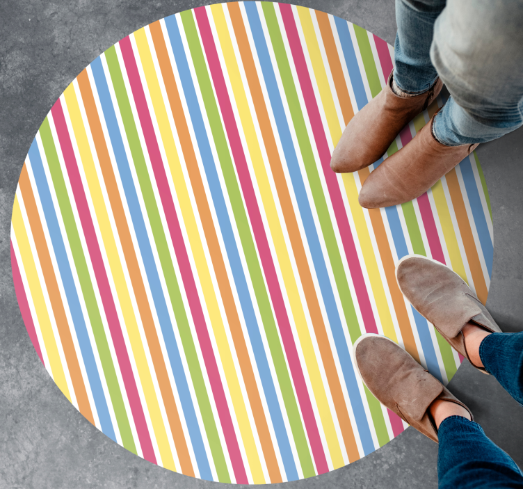 Opplev et fargerikt og livlig design med vårt vinyl teppe striper livlig stripet stil. Dette teppet kombinerer striper og linjer i et lekent mønster som skaper en unik atmosfære i ethvert rom. Med sine flerfargede og levende toner, gir dette runde teppet liv til innredningen din!