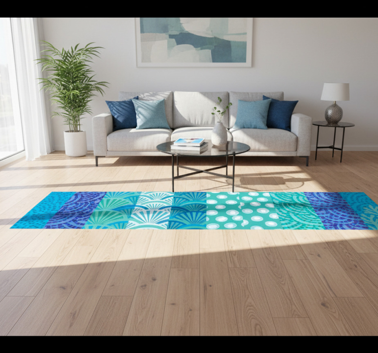 Referanse:: R21562Oppdag vårt vinyl teppe stue turkis havmønster, en fantastisk kombinasjon av stil og funksjonalitet! Dette teppet har et imponerende havmønster som gir liv til ethvert rom. Med sine nydelige farger og grafiske design, skaper det en unik atmosfære som både er inspirerende og innbydende. Dette vinylteppet er ikke bare vakkert, men også ripesikkert, anti-allergisk og brannsikkert, noe som gjør det perfekt for stuen din.