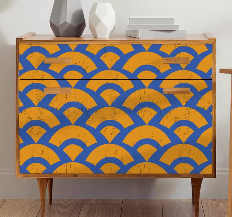 Oppdag det fantastiske Bølge mønster klistremerke møbler som forvandler ethvert rom med sitt unike design. Dette klistremerket har et grafisk uttrykk med mønster og buer som kombinerer geometriske former i en nydelig blå og oransje palett. Den minimalistiske og abstrakte stilen gir en moderne touch som passer perfekt inn i enhver innredning!
