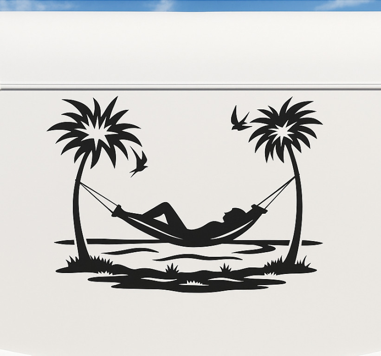 Referanse:: A54326Oppdag vårt unike Campingvogn klistremerke strandliv hengekøye, designet med en fantastisk grafisk stil som fanger essensen av avslapning og eventyr. Dette klistremerket har en satengfinish som gir utmerket fargeintensitet, samtidig som det reduserer refleksjoner fra lys. Det er laget av slitesterk vinyl, og kan enkelt rengjøres med en fuktig klut og litt nøytral såpe.
