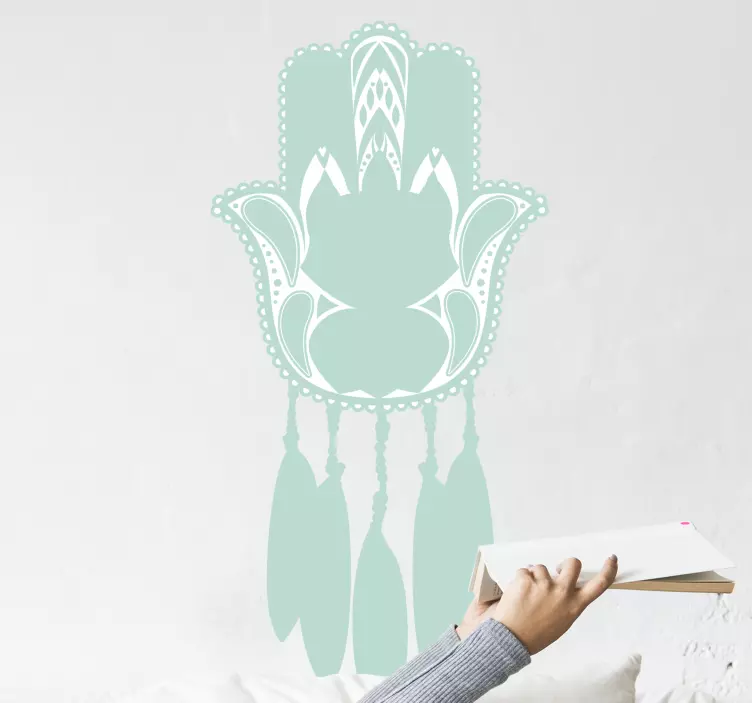 Oppdag vårt dekorative klistremerke med elegant botanisk emblem, hvor grafisk design møter naturens skjønnhet! Dette unike designet inkluderer en drømmefanger, hånd, og florale elementer i en elegant sammensetning. Fargene, med fokus på turkis, gir et kunstnerisk preg som vil lyse opp ethvert rom og skape en harmonisk atmosfære.