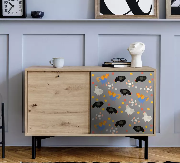 Oppdag vårt Dyr klistremerke med mønster av gårdsdyr, som kombinerer fargerike og lekne design med grafiske elementer som møbler, kyllinger og dyr. Dette unike klistremerket gir liv til ethvert rom med sitt livlige mønster og kreative detaljer, perfekt for å skape en koselig og inspirerende atmosfære.