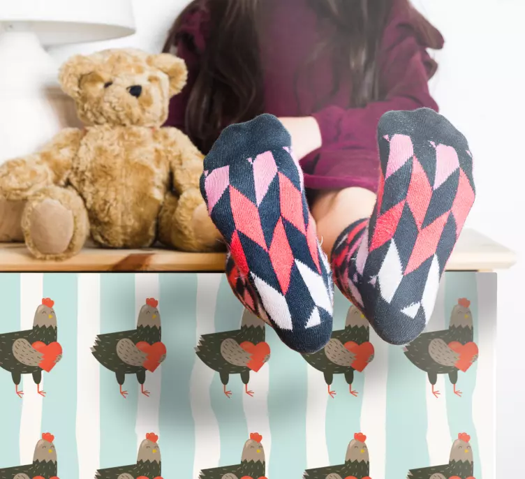 Oppdag vårt Dyr klistremerke med sjarmerende kyllingmønster, som fanger oppmerksomheten med et grafisk design som sprudler av liv! Dette mønsteret inkluderer en vakker hane, søte haner, hjerter og striper, perfekt for å gi et lekent preg til ethvert rom. Den fargerike og sjarmerende stilen gjør dette klistremerket ideelt for møbler og gård dekorasjon, og gir et hint av dyreliv som vil glede både barn og voksne!