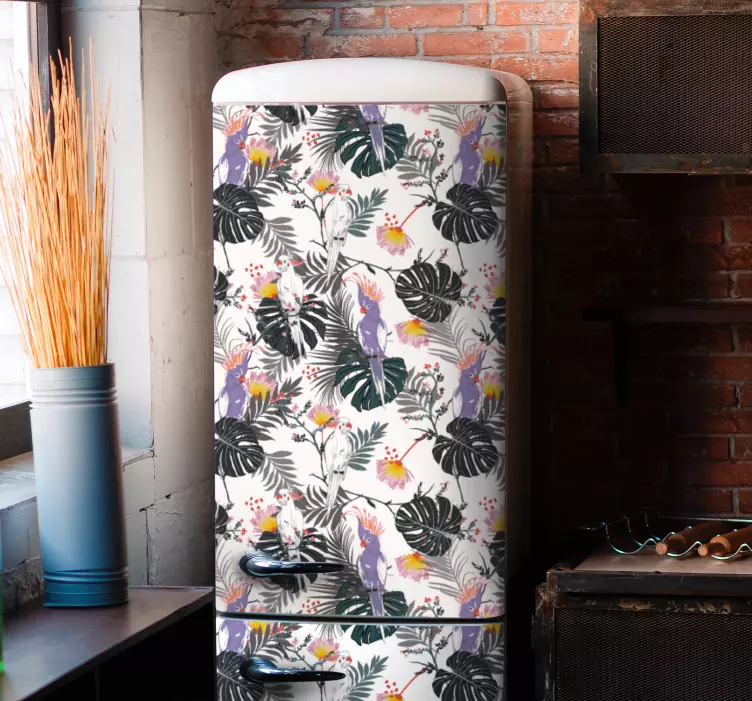Oppdag vårt unike Dyr klistremerke med tropisk blomstertrykk, designet med en fantastisk grafisk stil som fanger essensen av tropene! Dette klistremerket er prydet med fargerike blader, livlige papegøyer og kakaduer, som gir et friskt pust av naturen inn i hjemmet ditt. Den tropiske floralen og grønne områder gir en herlig atmosfære, perfekt for å lyse opp ethvert rom.