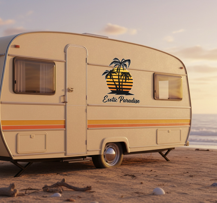 Kjøp Exotisk paradis solnedgang campingvogn klistremerke fra vår nettbutikk for å få et produkt av høy kvalitet laget spesielt for campingvogner, men som også kan brukes på alle flate overflater. Vi tilbyr et unikt design, og med vår bestillingsprosess kan du få et klistremerke som er perfekt tilpasset dine behov. Gjør campingopplevelsen din enda bedre med vårt fantastiske klistremerke!
