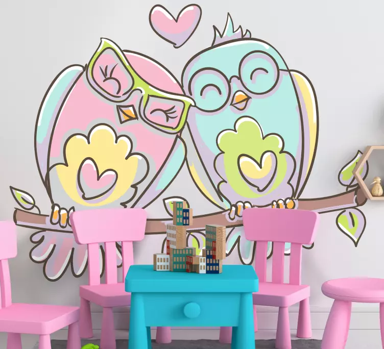 Oppdag vårt fantastiske Fugl klistremerker søte kjærlighetsfugler, et grafisk design som fanger øyet! Dette klistremerket inkluderer ugler i søte par, som utstråler kjærlighet og glede. De fargerike fuglene i rosa og blå toner vil gi ethvert rom et lykkelig preg og skape en koselig atmosfære!