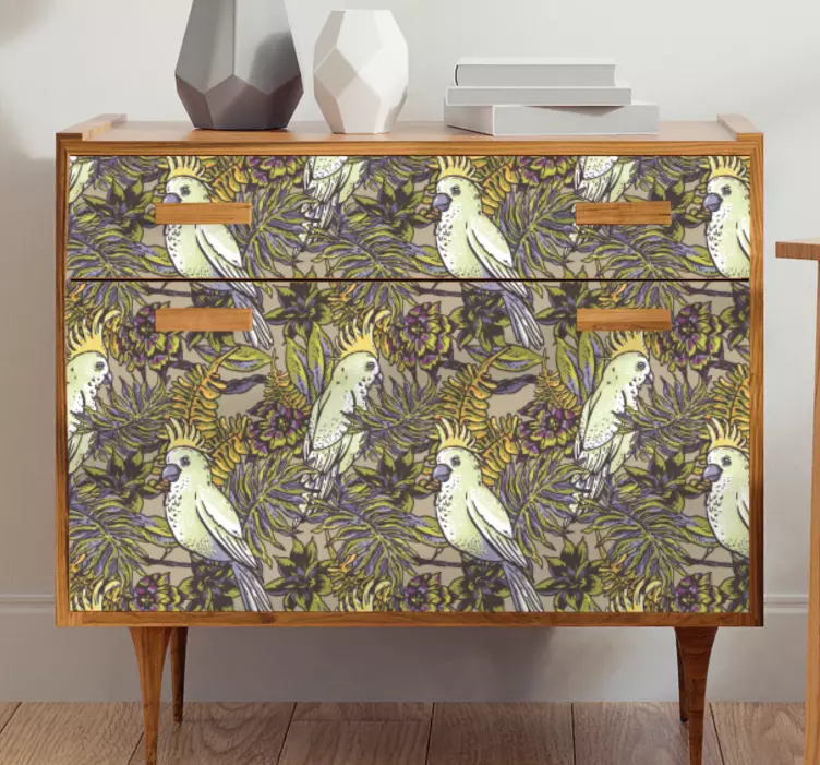 Oppdag et unikt Fugleliv inspirert design klistremerke møbler som forvandler ethvert rom til et tropisk paradis! Dette grafiske designet omfavner skjønnheten i naturen med detaljerte illustrasjoner av papegøyer, blader, blomster og fugler. De fargerike mønstrene gir liv til møbler og skaper en herlig atmosfære, perfekt for å bringe inn florale elementer i hjemmet.