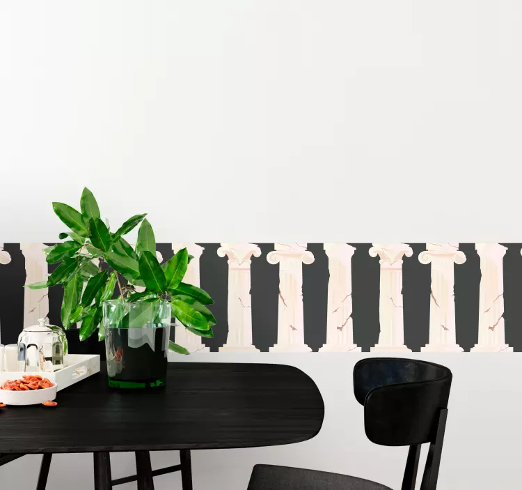 Oppdag vårt Kant klistremerke klassisk søyle design som kombinerer et antikt gresk tema med elegante kolonner og en stilig marmorinnsats. Den svarte bakgrunnen gir en dramatisk kontrast som fremhever de tradisjonelle elementene, perfekt for både moderne og klassisk interiør. Dette klistremerket er et utmerket valg for de som ønsker å tilføre et snev av tidløs eleganse til hjemmet sitt.