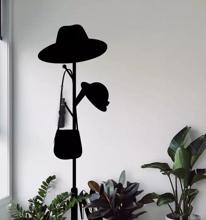 Referanse:: A51372Denne stilige, moderne hattholderen viser elegante silhuetter av ulike hodeplagg og en stilfull håndveske. Den er designet for å organisere og vise frem dine favoritt-tilbehør, og tilfører både funksjonalitet og eleganse til rommet ditt.