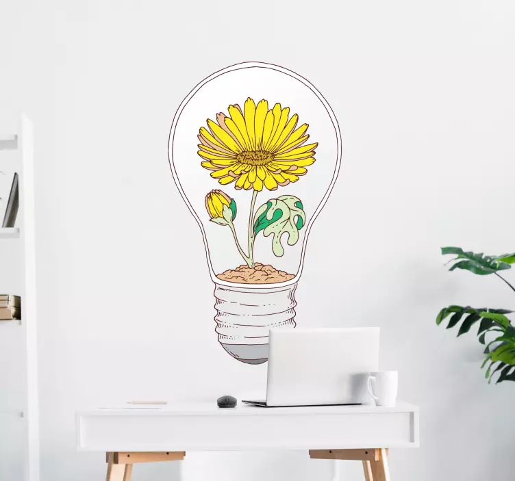 Oppdag magien med vårt klistremerke dyr blomstrende lyspære, hvor et vakkert design kombinerer en lyspære, solsikker, blader og blomster i en harmonisk illustrasjon. Dette produktet bringer naturens skjønnhet inn i hjemmet ditt, og gir et friskt pust av vekst og liv. Med sine klare gule farger skaper det en livlig atmosfære som lyser opp ethvert rom!