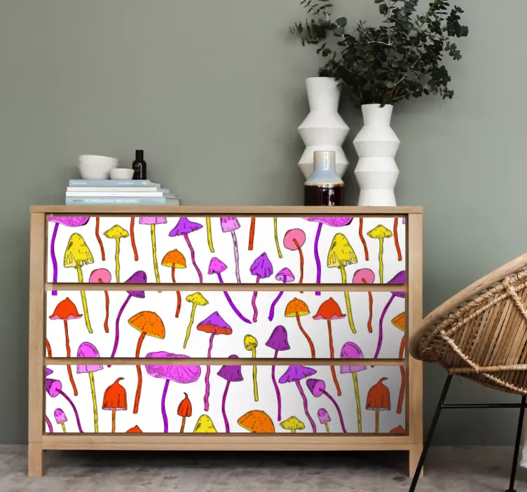 Oppdag det unike designet av våre klistremerker med fargerike soppmønstre! Dette grafiske mesterverket kombinerer vakre elementer fra natur og flora med en psykedelisk stil som vil forvandle ethvert rom. De livlige fargene og de intrikate illustrasjonene av sopp skaper en magisk atmosfære som virkelig fanger oppmerksomheten.